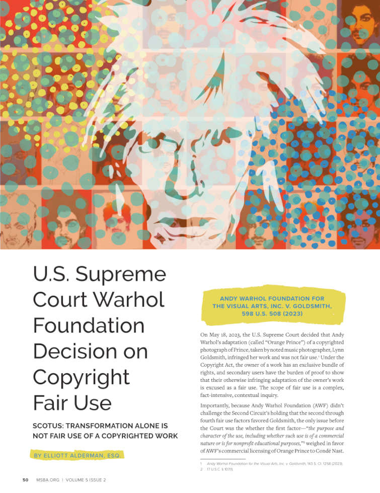 On May 18, 2023, the U.S. Supreme Court decided that Andy Warhol’s adaptation (called “Orange Prince”) of a copyrighted photograph of Prince, taken by noted music photographer, Lynn Goldsmith, infringed her work and was not fair use.1 Under the Copyright Act, the owner of a work has an exclusive bundle of rights, and secondary users have the burden of proof to show that their otherwise infringing adaptation of the owner’s work is excused as a fair use. The scope of fair use is a complex, fact-intensive, contextual inquiry.